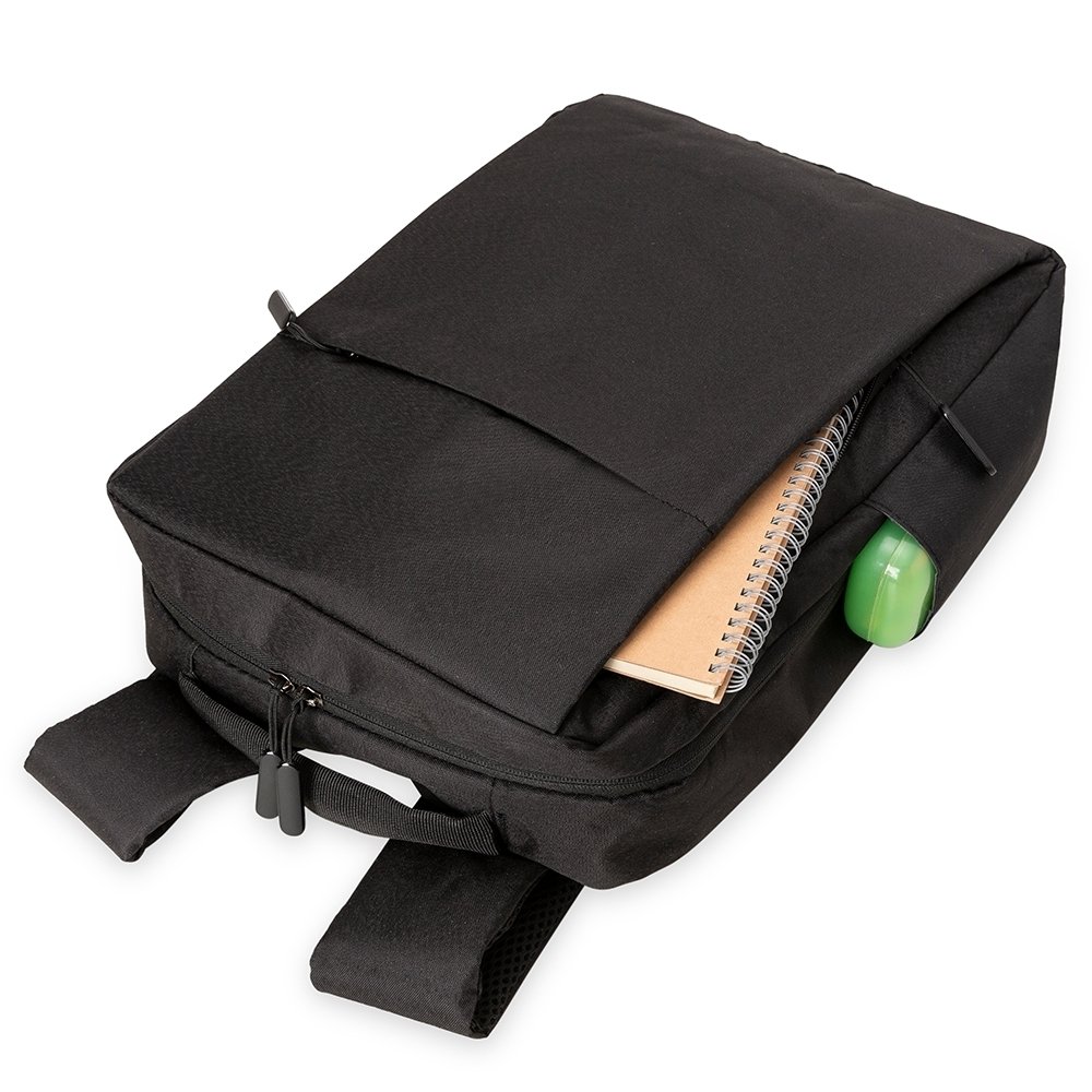 Contém compartimento grande com divisórias para documentos, eletrônicos e caneta, compartimento mediano com abertura vertical, compartimento frontal, bolsos laterais e adaptador USB externo com cabo acoplado, permitindo a conexão de um carregador portátil de dentro da mochila e transferência da carga para o lado externo, ocultando o carregador e viabilizando a utilização do celular durante o processo.