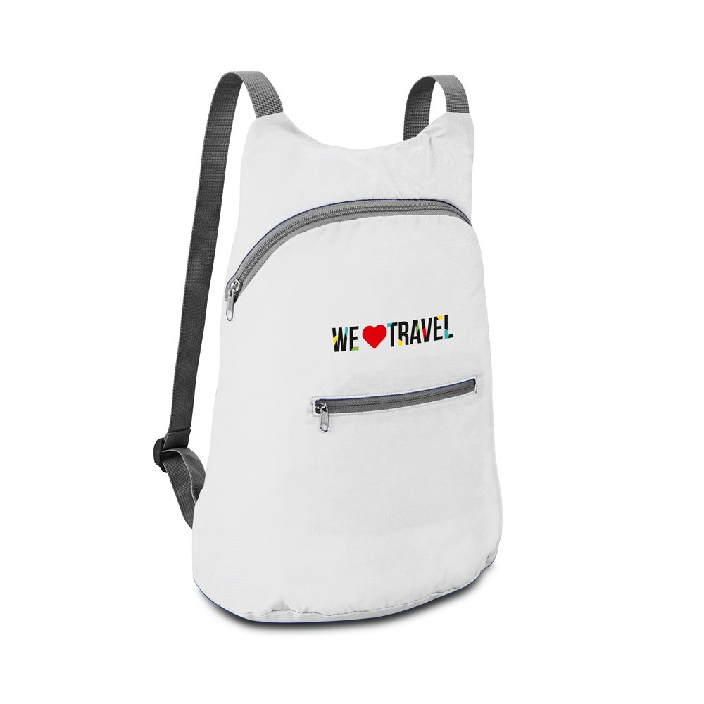 Mochila dobrável. 210D ripstop. Com bolso frontal.