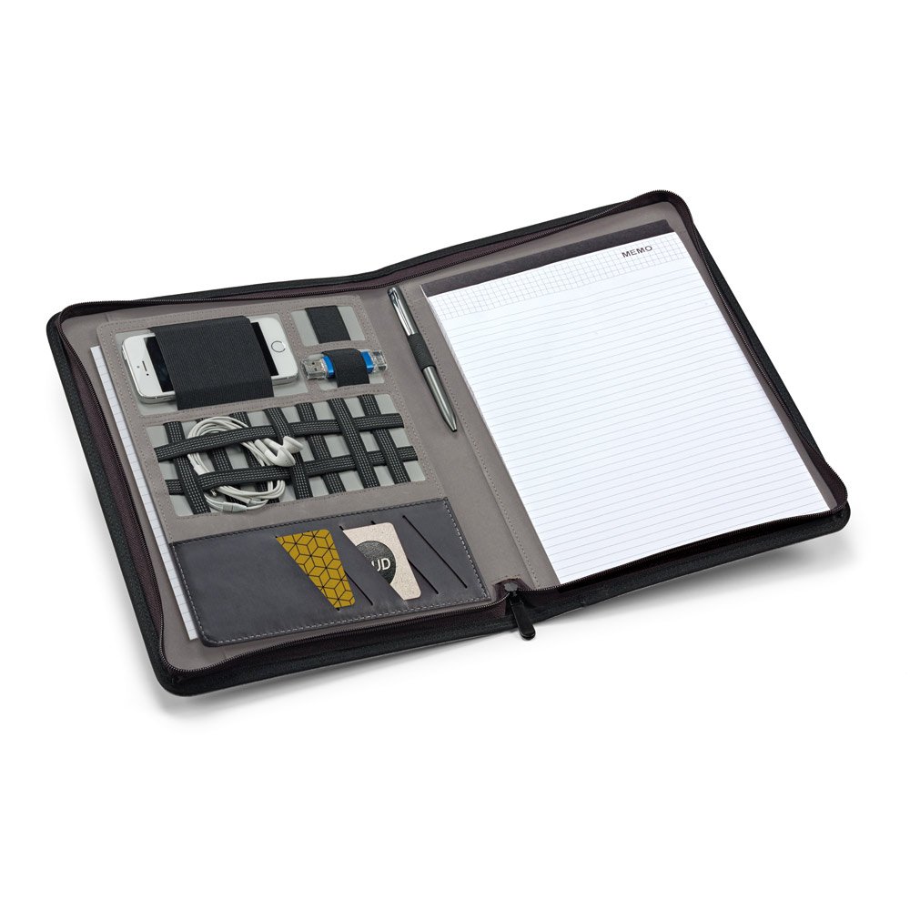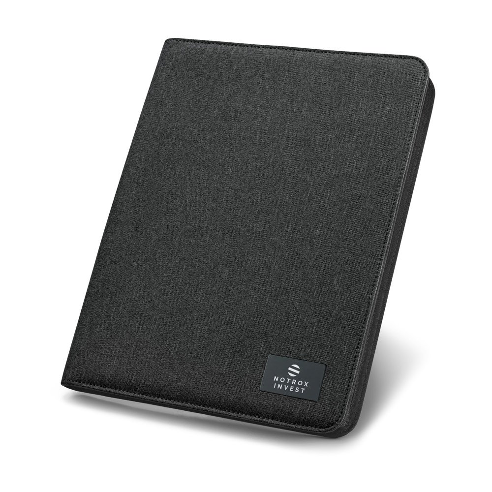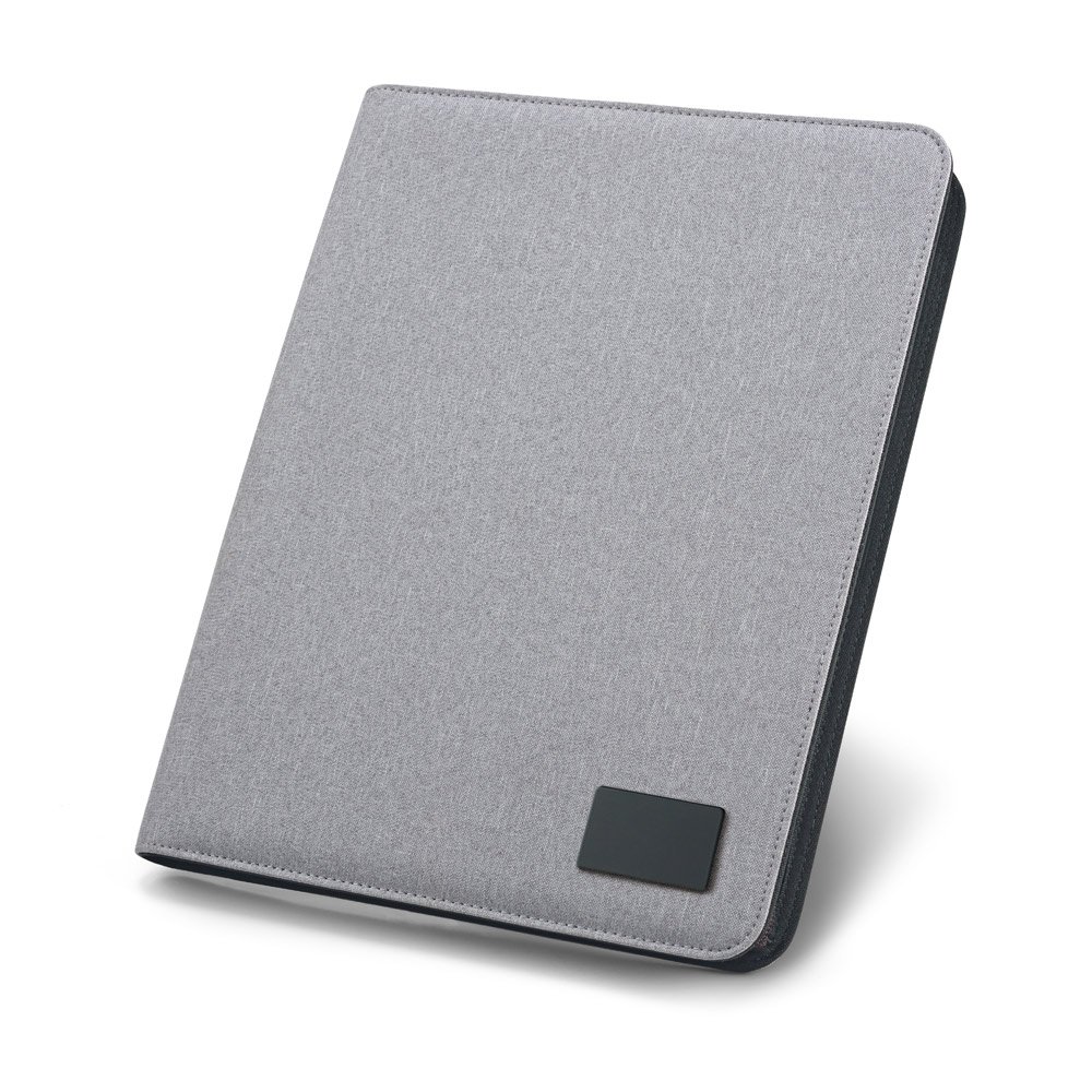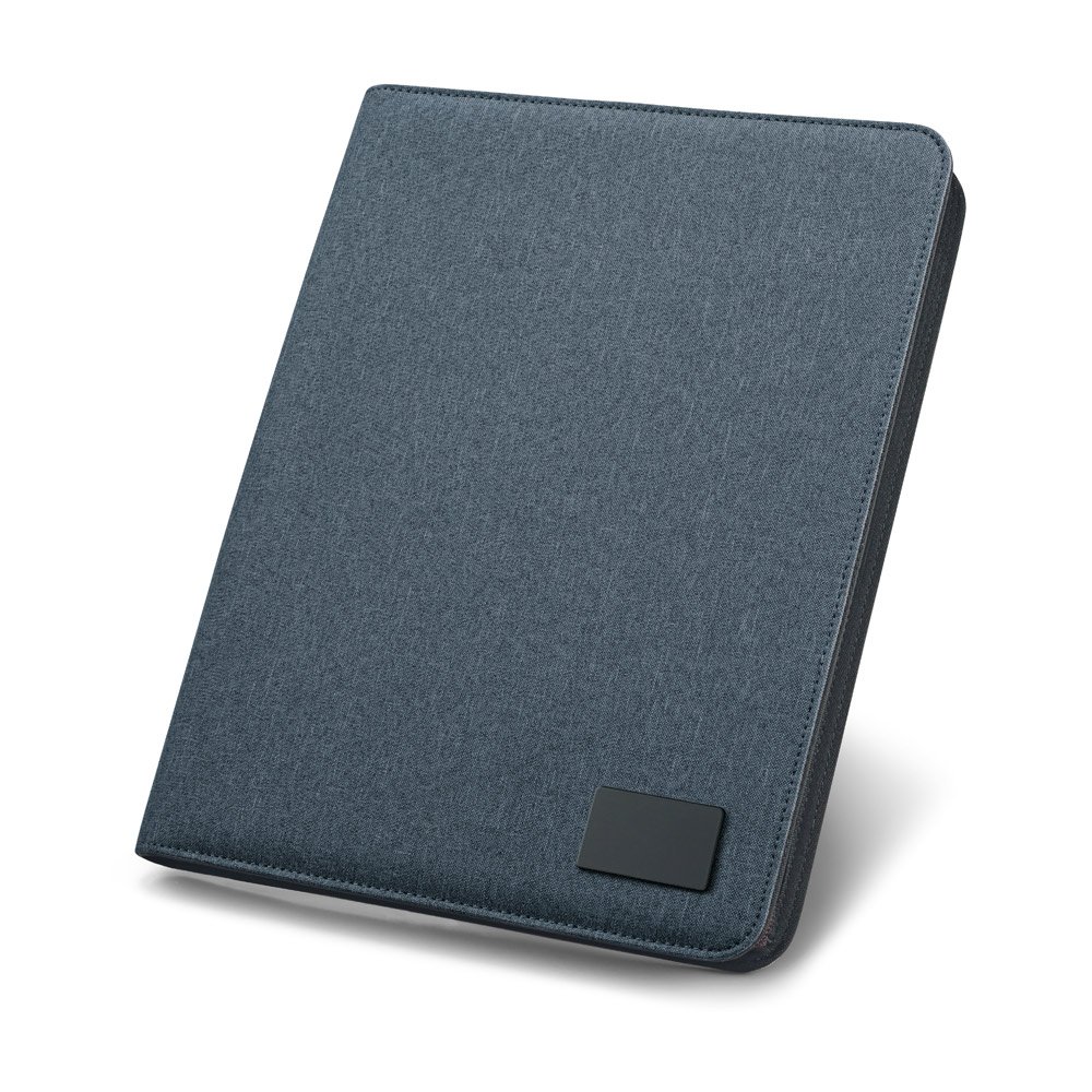 Pasta A4 em linho sintético e c. sintético com placa metálica com acabamento emborrachado. No interior, contém um bloco (20 folhas pautadas), suporte para esferográfica (não inclusa) e outros compartimentos para acessórios (não inclusos). 259 x 336 x 27 mm | Placa: 50 x 30 mm