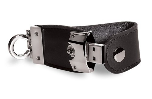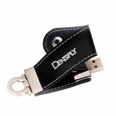 Pen drive de couro sintético com costura, possui botão e detalhes prata(verso liso). Parte inferior possui “argola” para utilizar como chaveiro.