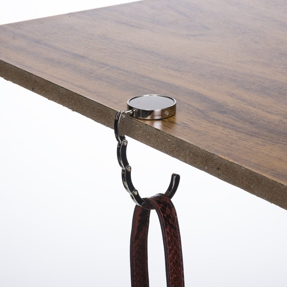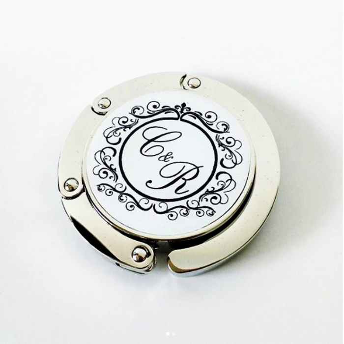 Porta bolsa de metal dobrável, possui chapa central redonda para gravação e parte traseira borracha anti deslizante. Para utilizar o porta bolsa basta puxar a lateral(é imantado) e abri-lo. Porta bolsa de metal dobrável, possui chapa central redonda para gravação e parte traseira borracha anti deslizante.