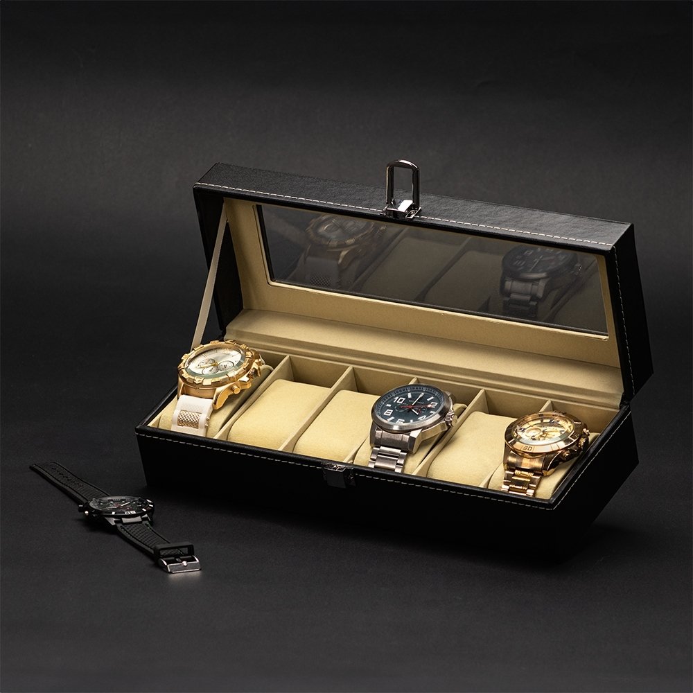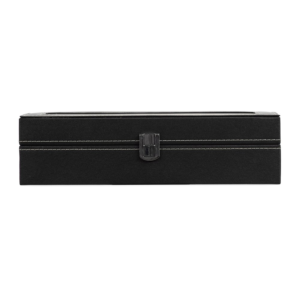 Descrição: Porta-relógios com acabamento em couro sintético e interior revestido em veludo. Possui seis divisórias com almofadas removíveis, tampa com visor em acrílico e abertura em 90 graus, facilitando a visualização e o manuseio dos acessórios. Conta com trava de segurança para fechamento do estojo.