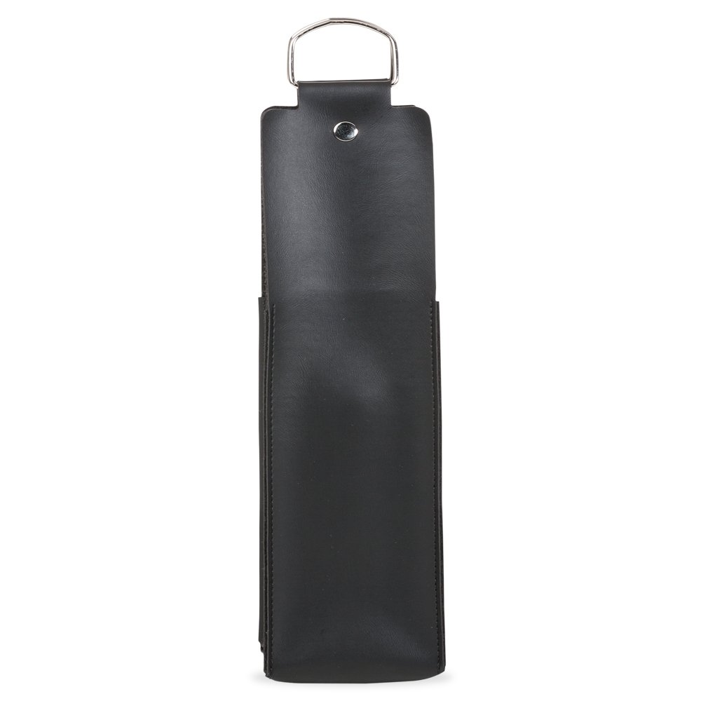 Estojo porta vinho em couro sintético bidim, contém duas alças metálicas e botão para lacre.
