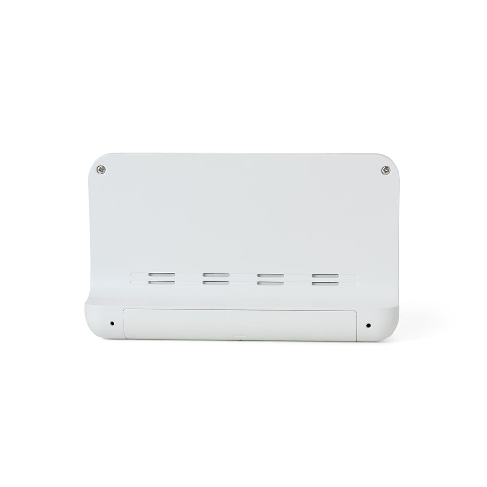Relógio digital com alarme. Produzido em plástico, o relógio possui um display LCD com exibição das horas, dias da semana, data, alarme, relógio de contagem progressiva e regressiva, temperatura, clima e umidade, parte frontal inferior com botões para ajustes, e parte traseira com compartimento para 2 pilhas AAA (não acompanha). Acompanha manual de instruções em inglês