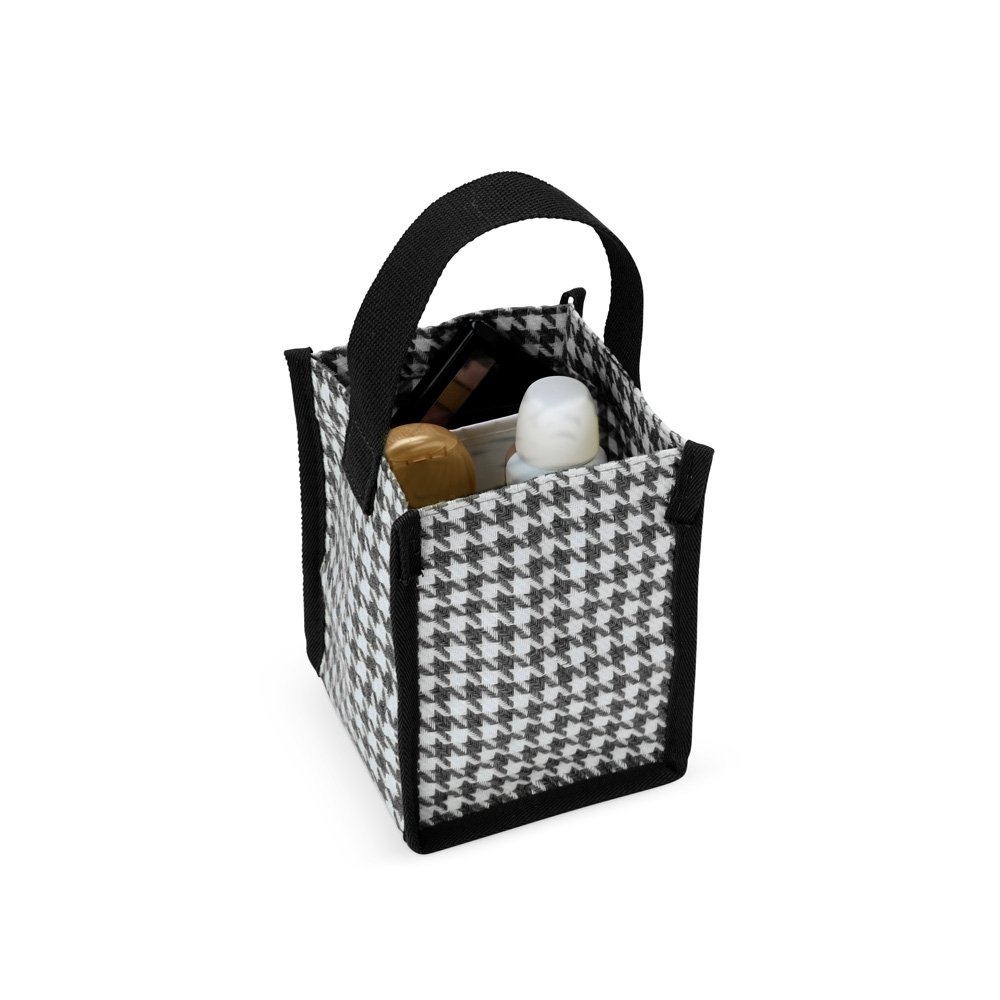 Descrição: A nossa sacola compacta estampada é a combinação perfeita de elegância e praticidade. Feita em poliéster, com um charmoso padrão pied-de-poule, ela traz um toque clássico e sofisticado. Funcional, é ideal para levar aqueles itens que podem facilmente se perder em bolsas maiores no dia a dia. Sua alça permite transportá-la para qualquer lugar com conforto. Um acessório pequeno no tamanho, mas grande na versatilidade de transformar qualquer visual.