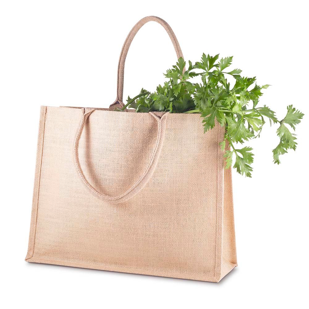 Sacola de Juta 360g/m². Alças resistentes de Algodão Cru. Base plana para maior estabilidade, interior revestido em plástico PP. Alça com altura de 20 cm, ideal para transporte.