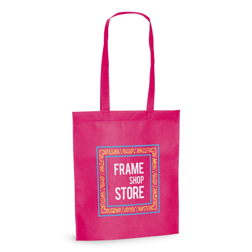 Sacola. Non-woven: 80 g/m². Termo-selado. Alças de 75 cm.