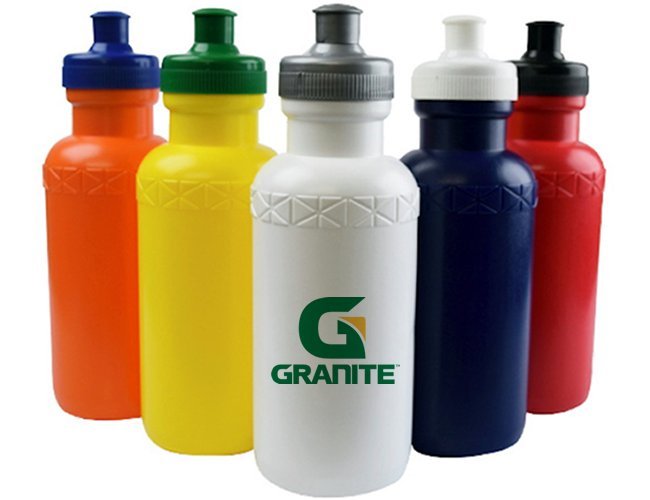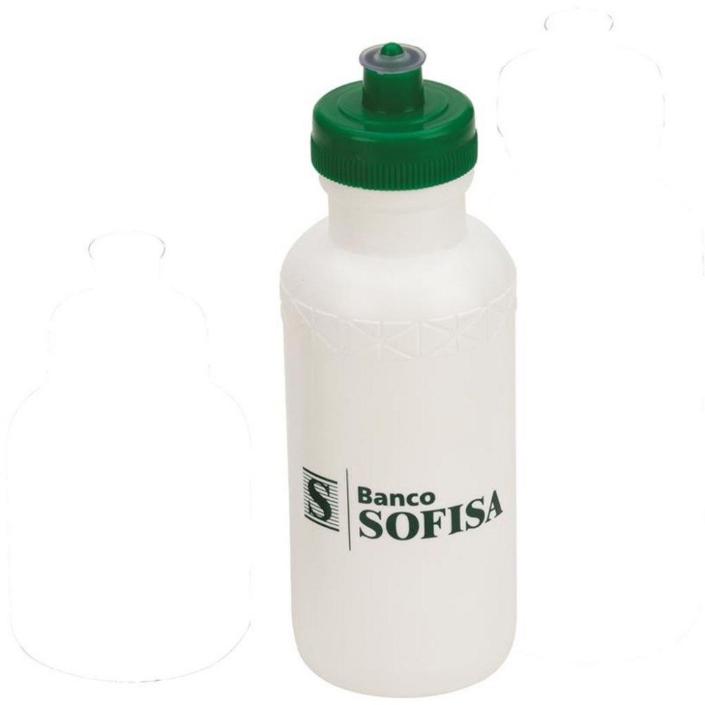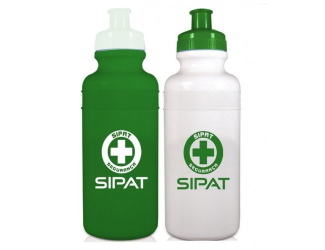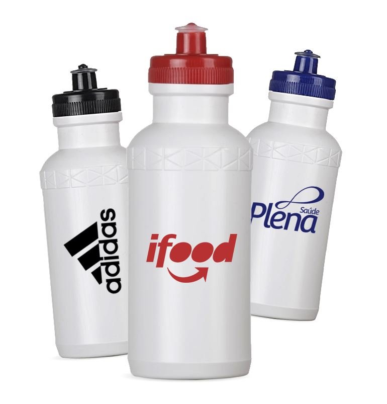 Squeeze 500ml: Plástico resistente, possui detalhe em relevo na parte superior e tampa de bico (plástico) rosqueável.