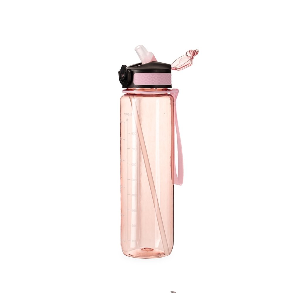 Descrição: Squeeze plástico livre de BPA com capacidade máxima de 1,05L e marcação de volume de até 1L. Possui tampa rosqueável com bico flip, tampa protetora, botão de acionamento com trava de segurança. Acompanha canudo interno em plástico e alça para transporte em nylon.