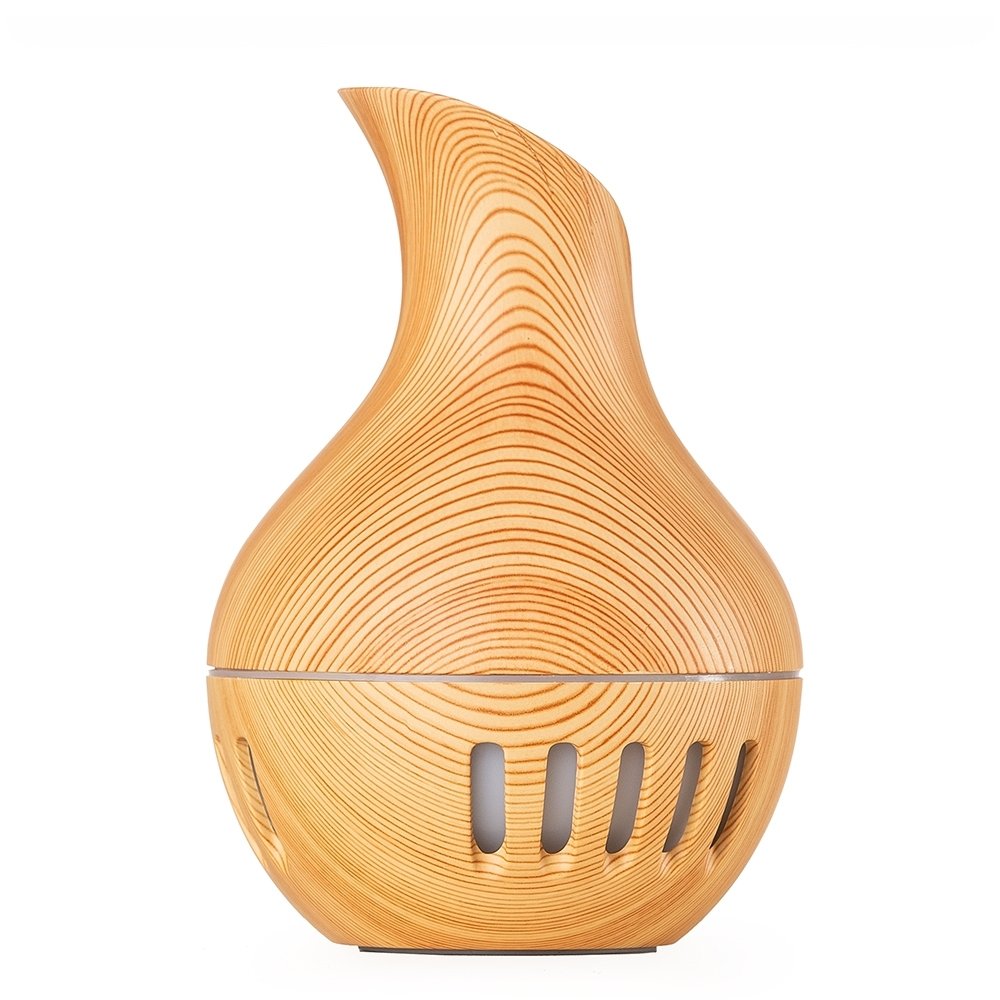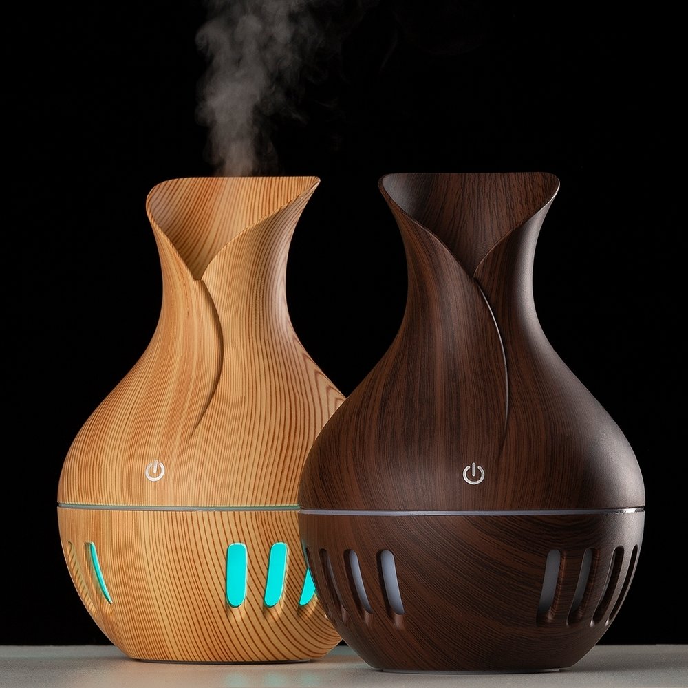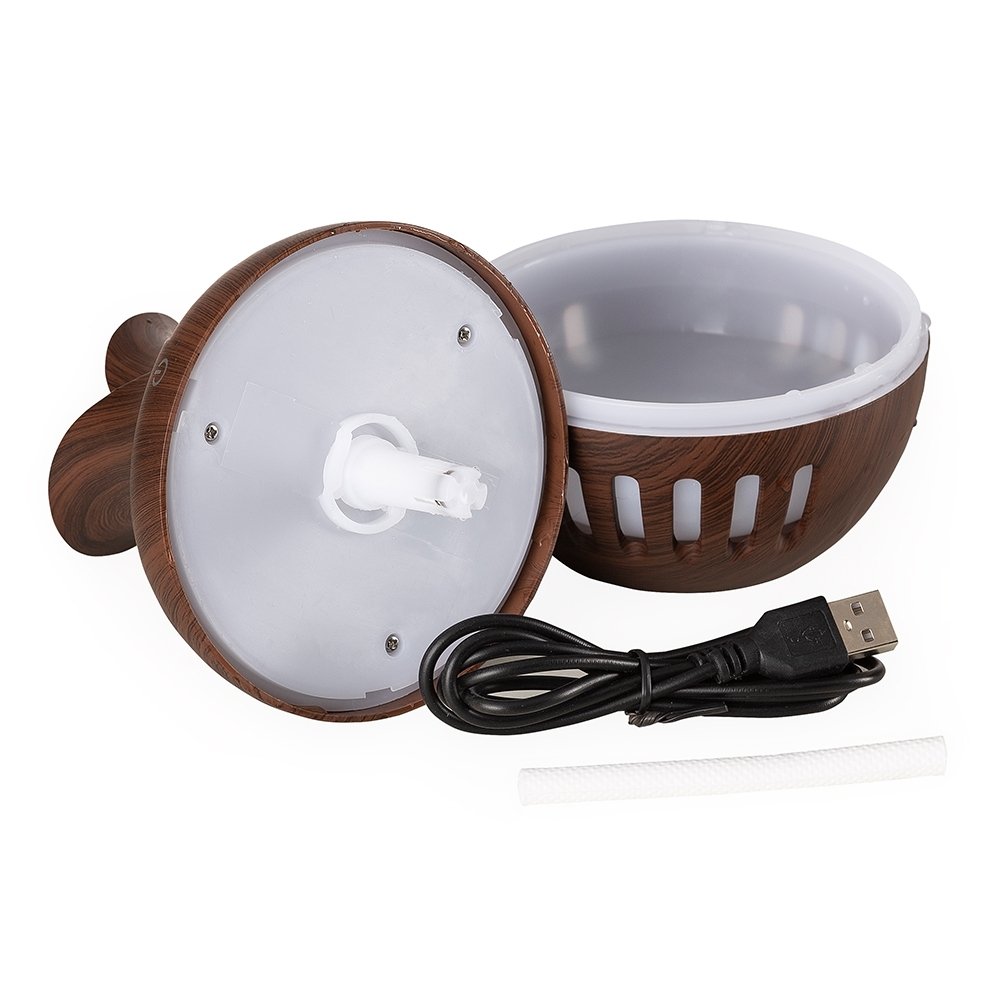 Umidificador ultrassônico com show de luzes em led. Produzido em material plástico com estilização similar a madeira, o umidificador possuí capacidade de até 130ml e funciona apenas a base de água. O produto não armazena carga, a sua utilização só pode ser feita com cabo USB. Taxa de consumo de <3W e taxa de tensão de DC5V. Acompanha refil de filtro de algodão e um cabo USB. Obs.: A limpeza Obs.: Atenção, não devem ser utilizadas essências!